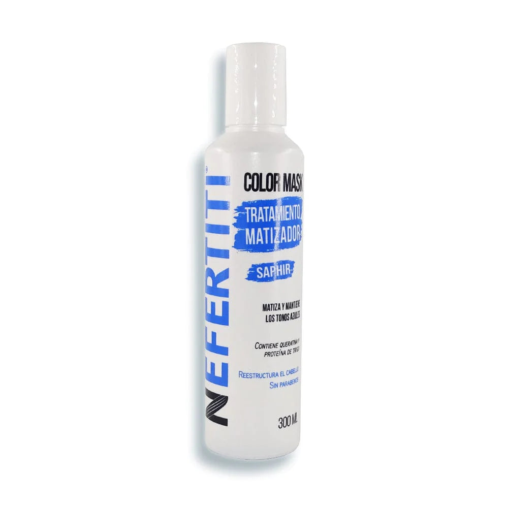 ¡Luce un azul envidiable sin teñir tu cabello!Color Mask Saphir de Nefertiti matiza y mantiene los tonos azules del cabello. Contiene Queratina y Proteína de Trigo que reestructuran el cabello.