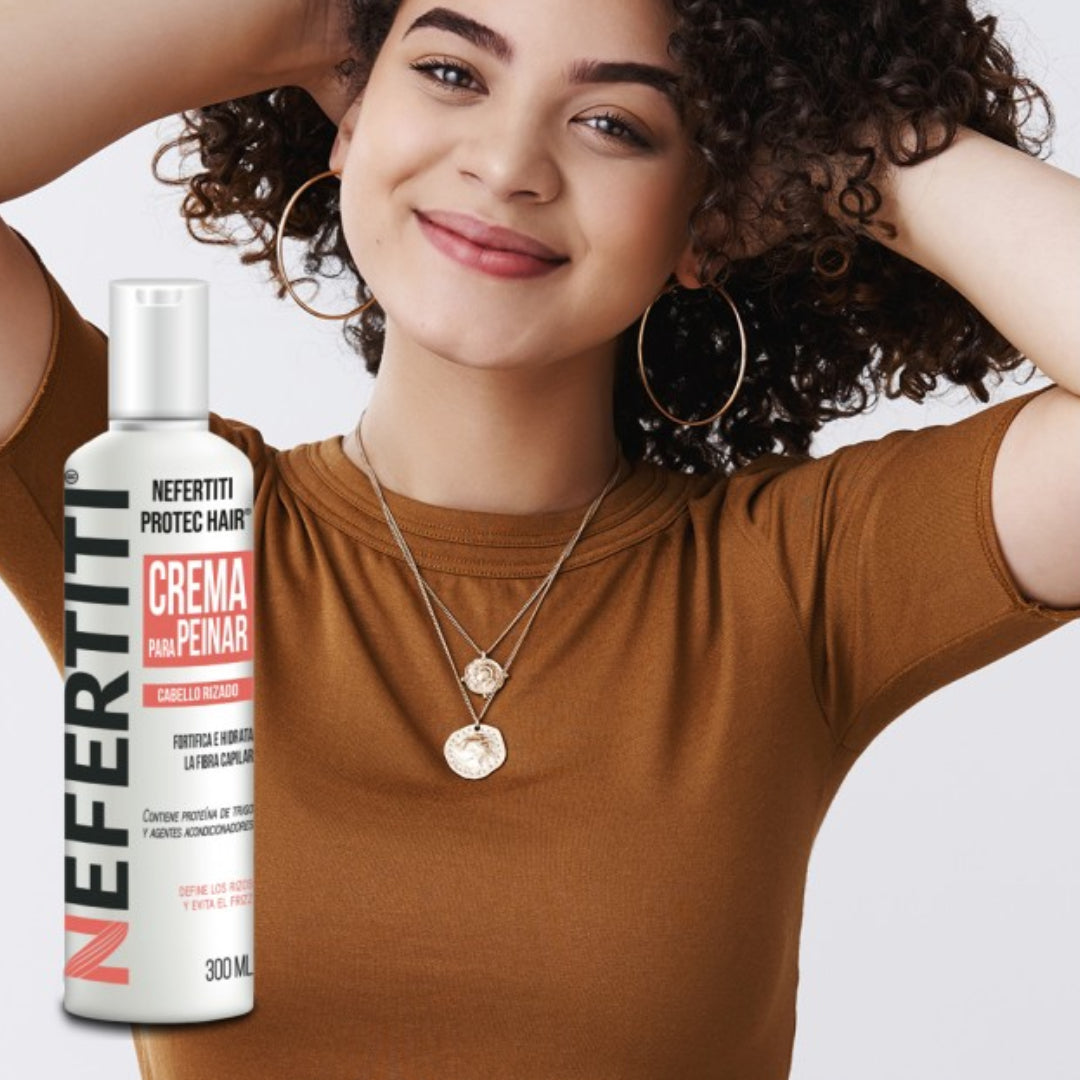 ¡Define los rizos y evita el frizz! Crema para Peinar Protec Hair cabello Rizado de Nefertiti fortifica e hidrata la fibra capilar. Contiene Proteína de Trigo y Agentes acondicionadores que humectan a profundidad el cabello logrando rizos bien definidos y sin frizz.